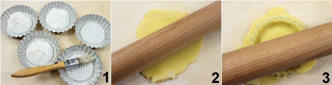 Buttern und mehlen Sie sechs Törtchenformen mit einem Durchmesser von etwa 8 cm gut ein 1. Nach der Ruhezeit im Kühlschrank rollen Sie den Mürbeteig mit einem Nudelholz zu einem etwa 3 mm dicken Blatt aus 2, schneiden Sie ihn in etwa 10 cm große Quadrate und legen Sie jedes Quadrat auf die Törtchenformen, sodass es gut auf dem Boden und den Seiten der Formen haftet. Entfernen Sie schließlich den überschüssigen Teig mit Hilfe eines Nudelholzes 3.