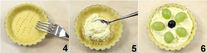 Stechen Sie dann den Boden der Törtchen mit den Zinken einer Gabel ein 4 und geben Sie auf jedes einen großzügigen Esslöffel Frangipane-Creme 5, die Sie dann mit der Rückseite des Löffels glätten. Waschen Sie die weißen Trauben und schneiden Sie die Beeren in Hälften (falls vorhanden, entfernen Sie die inneren Kerne). Legen Sie die Traubenhälften auf die Frangipane-Creme, um die Blütenblätter einer Blume zu formen. Legen Sie in die Mitte jeder Blume eine kleine schwarze Traube 6.