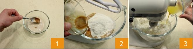 Um das Trikolore-Brot zuzubereiten, löst die Trockenhefe in etwas lauwarmem Wasser auf (von den 250 ml, die für den Teig benötigt werden) und fügt das Malz hinzu 1 (ihr könnt das Malz durch Zucker ersetzen: In diesem Fall fügt es dem gesiebten Mehl hinzu). Rührt mit einem Teelöffel um und fügt die Mischung zum gesiebten Mehl hinzu, das in die Schüssel einer Küchenmaschine gegeben wurde 2; verarbeitet die Zutaten mit dem Flachrührer bei mittlerer Geschwindigkeit und fügt dann das Ei hinzu 3