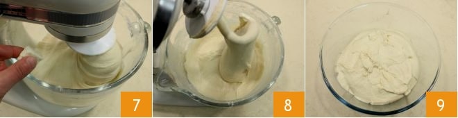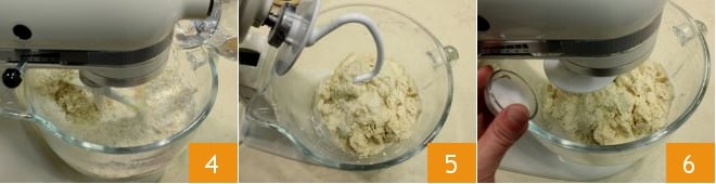 und die für den Teig angegebene Menge lauwarmes Wasser 4. Knetet weiter, und wenn der Teig homogen ist, stoppt die Küchenmaschine, ersetzt den Flachrührer durch den Knethaken 5 und gebt das Salz hinzu 6