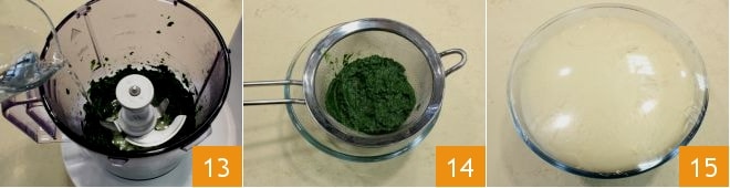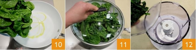 In der Zwischenzeit wascht den Spinat und dünstet ihn in einer Pfanne mit einem Schuss Öl bedeckt mit einem Deckel (10-11). Sobald sie gekocht sind, lasst sie abkühlen und gebt sie dann in einen Mixer 12