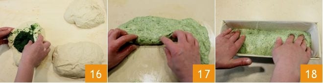 legt ihn auf eine leicht geölte Arbeitsfläche und teilt ihn in drei Teile (die Teile, die ihr nicht sofort verwendet, könnt ihr in Frischhaltefolie wickeln) und mischt einen Teil mit dem Spinat 16, indem ihr ihn gleichmäßig unterknetet 17. Dann fettet und legt eine Kastenform von 30x11 cm mit Backpapier aus und gebt den grünen Teig hinein 18.