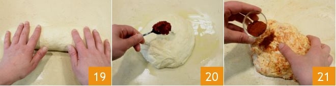 Fahrt fort, indem ihr den hellen Teig bearbeitet und ihm die Form eines Laibs in der Größe der Form gebt 19, und legt ihn auf den grünen Teig in der Form. Würzt dann den letzten Teigteil mit Tomatenmark 20 und Paprika 21.