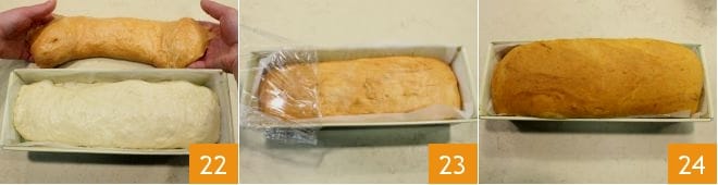Verfahrt auf die gleiche Weise und legt auch den roten Teig in die Form 22. Deckt ihn mit Frischhaltefolie ab 23 und lasst ihn mindestens 30 Minuten aufgehen, fern von Zugluft. Nach der erforderlichen Zeit das Trikolore-Brot im vorgeheizten statischen Ofen bei 200° etwa 60 Minuten backen (bei Umluftofen 180° für 50 Minuten). Überprüft die Garzeit mit einem Zahnstocher, bevor ihr das Backen beendet; wenn das Trikolore-Brot gar ist, aus dem Ofen nehmen und mindestens 20 Minuten in der Form abkühlen lassen 24 und dann auf einem Rost umdrehen, um es vollständig abkühlen zu lassen!