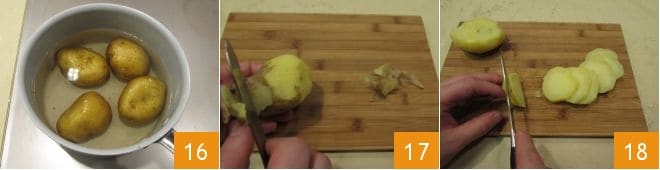 In einem separaten Topf die sauberen Kartoffeln mit Schale geben und etwa 30 Minuten kochen 16. Um die Zeit zu verkürzen, können Sie einen Schnellkochtopf verwenden und sie 15 Minuten kochen. Wichtig ist, dass die Kartoffeln beim Kochen nicht zerfallen, sondern fest bleiben. Sobald sie gekocht sind, lassen Sie sie lauwarm werden, entfernen Sie die Schale 17 und schneiden Sie sie in Scheiben von einem halben cm 18.