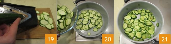 In der Zwischenzeit die Zucchini putzen und mit einem Hobel in Scheiben schneiden 19. In einer anderen Pfanne das restliche Öl mit den Knoblauchzehen erhitzen. Sobald sie goldbraun sind, entfernen Sie sie und fügen Sie die frisch geschnittenen Zucchini hinzu 20. Lassen Sie sie bei starker Hitze braten, damit sie knusprig bleiben, und rühren Sie gelegentlich um, dann salzen und pfeffern Sie 21.