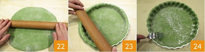 Nach den zwei Stunden nehmen Sie den Mürbeteig-Laib heraus und rollen ihn auf der Arbeitsfläche auf eine Dicke von einem halben cm aus 22. Fetten Sie eine Form mit einem Durchmesser von 26 cm ein und legen Sie sie mit dem ausgerollten Teig aus 23. Stechen Sie den Boden mit einer Gabel ein 24.