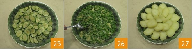 Jetzt fahren Sie mit der ersten Schicht fort, indem Sie die Zucchini so verteilen, dass sie den Boden bedecken 25, dann eine Schicht Erbsen 26 und schließlich den herzhaften Trikolore-Kuchen mit den Kartoffeln abschließen 27.