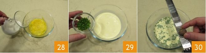 Bereiten Sie nun eine Sauce vor, um den herzhaften Trikolore-Kuchen zu bedecken: Schlagen Sie in einer Schüssel die Sahne zusammen mit den Eiern 28, salzen, pfeffern, fügen Sie den fein gehackten Schnittlauch 29 und die geriebene Muskatnuss hinzu 30.