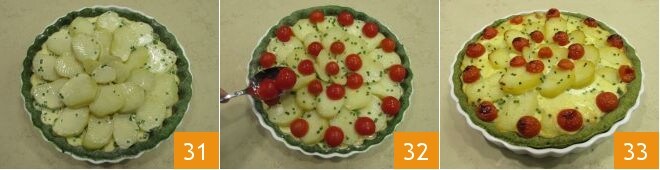 Gießen Sie die Mischung über den Kuchen 31, verteilen Sie sie auf der gesamten Oberfläche, bestreuen Sie sie mit getrocknetem Oregano und vervollständigen Sie sie mit den halbierten Kirschtomaten 32. In einem vorgeheizten, statischen Ofen bei 180° 45-50 Minuten backen (für Umluftofen bei 160° Grad für 35-40 Minuten) 33. Nehmen Sie den herzhaften Trikolore-Kuchen aus dem Ofen, lassen Sie ihn lauwarm werden und servieren Sie ihn in Scheiben geschnitten.