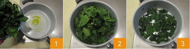 Um den herzhaften Trikolore-Kuchen zuzubereiten, beginnen Sie mit der Zubereitung des Mürbeteigs, indem Sie den Spinat säubern und in eine antihaftbeschichtete Pfanne mit einem Schuss Öl geben 1. Lassen Sie ihn ein paar Minuten welken und lauwarm werden (2-3).