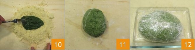 Übertragen Sie die Butter-Mehl-Mischung auf eine Arbeitsfläche und fügen Sie das Spinatpüree hinzu 10. Arbeiten Sie die Zutaten zügig mit den Händen, um sie nicht zu erwärmen, bis eine homogene Masse entsteht 11. Formen Sie einen Laib, wickeln Sie ihn in Frischhaltefolie und legen Sie ihn für mindestens zwei Stunden in den Kühlschrank, bis er fest ist 12.