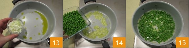 In der Zwischenzeit beginnen Sie mit der Zubereitung der Füllung für den herzhaften Trikolore-Kuchen. Schneiden Sie die Frühlingszwiebel dünn, geben Sie sie in eine Pfanne mit zwei Esslöffeln Öl 13 und lassen Sie sie bei mittlerer Hitze anbraten 14. Fügen Sie die Erbsen hinzu, salzen und pfeffern Sie und lassen Sie sie bei niedriger Hitze garen, bis sie zart sind 15.