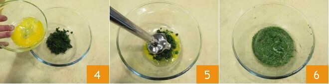 Sobald der Spinat kalt ist, geben Sie ihn in eine Schüssel und zerdrücken ihn leicht mit einer Gabel, dann fügen Sie das Ei hinzu 4. Pürieren Sie alles mit einem Stabmixer 5, bis eine Paste entsteht, die Sie verwenden, um den Mürbeteig zu würzen 6.