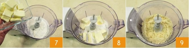 Dann geben Sie Mehl, kalte, gewürfelte Butter und Salz in einen Mixer (7-8). Schalten Sie ihn für einen Moment ein, um eine krümelige Mischung zu erhalten 9.