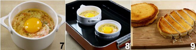 Setzen Sie ein Ei (darauf achten, dass es nicht zerbricht) auf jede Cocotte 7. Füllen Sie nun ein Backblech bis zur Hälfte mit kochendem Wasser, stellen Sie die Cocottes hinein 8 und backen Sie sie bei 180°C für 15 Minuten. Garnieren Sie mit gemahlenem Pfeffer, einigen Dillblättchen und servieren Sie die Eier im Cocotte mit Lachs, begleitet von in Streifen geschnittenem gegrilltem Brot 9.