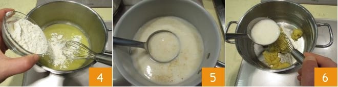 Wenn sie geschmolzen ist, fügen Sie das Mehl nach und nach hinzu 4 und rühren Sie schnell mit einem Schneebesen, bis Sie eine haselnussfarbene Mehlschwitze erhalten. Sobald die Milch heiß ist, nehmen Sie eine Kelle heraus 5 und geben Sie sie unter ständigem Rühren in die Mehlschwitze 6.