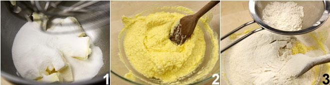Beginnen Sie mit der Zubereitung des Victoria Sandwich, indem Sie in einer Schüssel die weiche Butter, den Zucker und die Samen einer Vanilleschote 1 verrühren. Schlagen Sie mit den Rührbesen eines Handmixers, bis die Mischung hell und schaumig ist. Fügen Sie die Eier bei Zimmertemperatur nacheinander hinzu, schlagen Sie mit den Rührbesen und lassen Sie das erste Ei gut in die Mischung einziehen, bevor Sie das nächste hinzufügen. Sobald Sie eine schöne homogene Creme erhalten haben 2, mischen Sie mit einem Holzlöffel das zuvor vermischte und gesiebte Mehl und Backpulver 3 und eine Prise Salz ein,