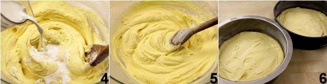 und fügen Sie abwechselnd die Milch hinzu 4. Mischen Sie die Zutaten gut 5 und verteilen Sie sie dann zu gleichen Teilen in zwei gebutterten und bemehlten Backformen 6 mit einem Durchmesser von 22 cm. Glätten Sie die Teige in den beiden Formen und backen Sie sie dann im vorgeheizten statischen Ofen bei 180°C für etwa 20 Minuten.