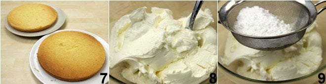 Wenn die beiden Böden fertig gebacken sind 7, nehmen Sie sie aus dem Ofen und lassen Sie sie vollständig auskühlen. Bereiten Sie die Creme für die Füllung des Victoria Sandwich zu, indem Sie in einer Schüssel Mascarpone und Philadelphia 8 vermischen; rühren Sie die beiden Frischkäse gut um sie zu erweichen, indem Sie einige Tropfen Vanilleextrakt und den gesiebten Puderzucker 9 hinzufügen.
