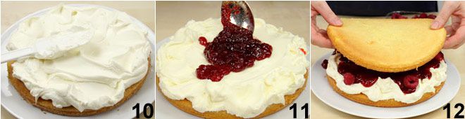 Platzieren Sie einen der beiden Kuchen auf einer Servierplatte, bedecken Sie ihn mit der Frischkäsecreme 10 und verstreichen Sie anschließend die Himbeermarmelade 11 auf der Oberfläche. Legen Sie frische Himbeeren darauf und bedecken Sie alles mit dem anderen Kuchen 12, wie ein Sandwich! Bestäuben Sie die Oberfläche des Victoria Sandwich mit Puderzucker und servieren Sie diese Köstlichkeit sofort! Bewahren Sie den Victoria Sandwich im Kühlschrank in einem Behälter mit Deckel auf.