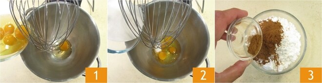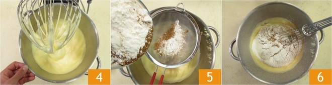 Wenn die Masse gut aufgeschlagen und schaumig ist 4, schalten Sie die Rührmaschine aus und sieben Sie die Mischung aus Zimt und Maisstärke hinein 5. Heben Sie die Pulver mit einem Schneebesen von Hand unter 6.