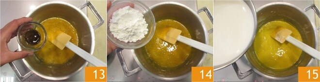 Nachdem Sie die Eigelbe gut mit dem Zucker vermischt haben, fügen Sie das Vanilleextrakt 13 und die Maisstärke 14 hinzu und mischen Sie erneut mit dem Spatel. Wenn die Milch kurz vor dem Siedepunkt ist, fügen Sie sie nach und nach zur Eigelbmischung hinzu 15.