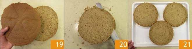 In der Zwischenzeit nehmen Sie den Biskuit und schneiden Sie die obere Kruste ab 19, dann schneiden Sie ihn in 3 gleich dicke Scheiben 20 21.