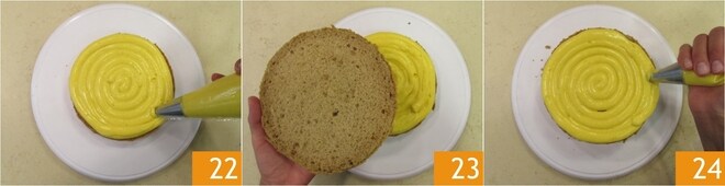 Nehmen Sie die Creme aus dem Kühlschrank, rühren Sie sie nochmals um und füllen Sie sie in einen Spritzbeutel mit 1 cm glatter Tülle. Legen Sie die erste Biskuitscheibe auf eine Servierplatte und füllen Sie sie mit der Hälfte der Vanillecreme 22, dann legen Sie die zweite Scheibe darauf 23 und geben Sie die restliche Creme hinzu 24.