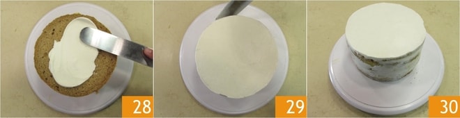 Nach der Kühlzeit bedecken Sie die Oberfläche der Torte mit einer leichten Schicht Creme und helfen Sie sich dabei mit einem Spatel 28, einschließlich der Seiten 29.