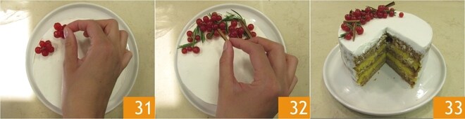 Zum Schluss garnieren Sie die Oberfläche mit Johannisbeeren 31, Rosmarinnadeln und Zimtstangen 32. Ihre weihnachtliche Naked Cake ist servierfertig 33!