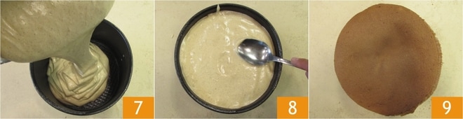Gießen Sie den Teig in eine 18 cm Durchmesser, mindestens 10 cm hohe Form, die Sie vorher eingefettet oder mit Backpapier ausgelegt haben 7. Glätten Sie die Oberfläche mit der Rückseite eines Löffels 8 und backen Sie sie im vorgeheizten statischen Ofen bei 180°C etwa 25 Minuten lang. Nachdem der Biskuit gebacken ist, nehmen Sie ihn aus dem Ofen und lassen Sie ihn vollständig in der Form abkühlen 9.