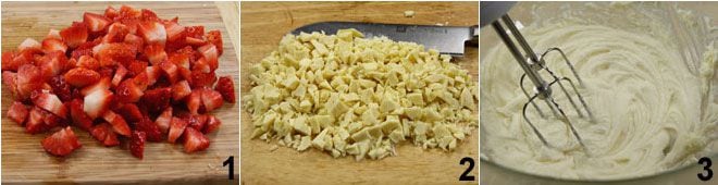 Um die Muffins mit Erdbeeren und weißer Schokolade zuzubereiten, beginnen Sie damit, den Ofen auf 180°C vorzuheizen; waschen Sie dann die Erdbeeren und schneiden Sie sie in kleine Stücke 1. Mit einem Messer schneiden Sie auch die weiße Schokolade in kleine Stücke 2 oder Sie können fertige weiße Schokoladenstücke verwenden. In einer Schüssel geben Sie die Butter bei Zimmertemperatur und fügen den Zucker hinzu, mit einem elektrischen Mixer verrühren Sie die Zutaten gut, bis die Mischung cremig wird 3.