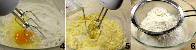 Fügen Sie die 3 Eier eins nach dem anderen hinzu 4, während Sie weiterhin mit dem Mixer arbeiten, und geben Sie die Milch nach und nach hinzu 5. Sieben Sie das Mehl, das Backpulver, das Natron, das Mark einer Vanilleschote und eine Prise Salz zusammen und geben Sie alles in den Teig 6,