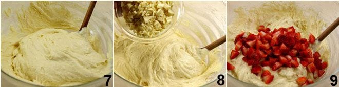 rühren Sie gut mit einem Holzlöffel, bis Sie eine glatte und klumpenfreie Mischung erhalten 7. Dann fügen Sie die weiße Schokolade 8 und die Erdbeerstücke 9 hinzu.