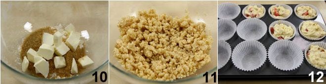 Kümmern Sie sich um die Zubereitung der knusprigen Kruste: In einer Schüssel geben Sie die kalte Butter aus dem Kühlschrank in Stückchen, den braunen Zucker und das Mehl 10 und mischen den Teig grob mit einem Holzlöffel oder mit den Fingern, um Streusel zu erhalten 11. Füllen Sie mit dem Teig 14 Muffinformen, die mit Papierförmchen ausgelegt sind, bis auf einen halben Zentimeter unter den Rand 12. Bedecken Sie dann die Muffins mit den Streuseln und backen Sie sie bei 180°C für etwa 35/40 Minuten (führen Sie den Stäbchentest durch, um die Garzeit zu überprüfen). Wenn die Muffins mit Erdbeeren und weißer Schokolade goldbraun sind, nehmen Sie sie aus dem Ofen und lassen Sie sie abkühlen, bevor Sie sie genießen.