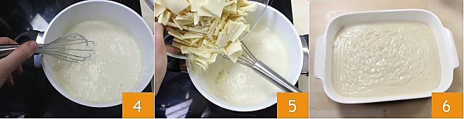 Geben Sie die Mischung in einen kleinen Topf und lassen Sie sie bei niedriger Hitze eindicken 4, unter ständigem Rühren. Schließlich fügen Sie die gehackte weiße Schokolade hinzu und setzen das Kochen fort, bis sie vollständig geschmolzen ist 5. Die Eifreie weiße Schokoladenpuddingcreme ist fertig 6: Geben Sie sie in einen breiten und flachen Behälter, decken Sie sie mit Frischhaltefolie direkt auf der Oberfläche ab und bewahren Sie sie nach dem Abkühlen im Kühlschrank auf, bis Sie sie verwenden möchten.
