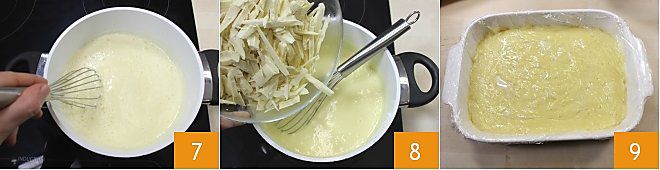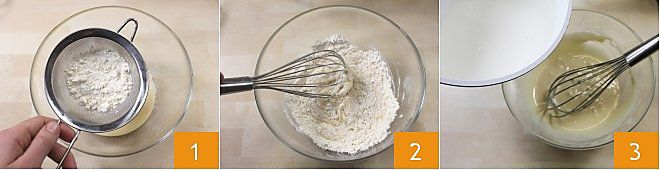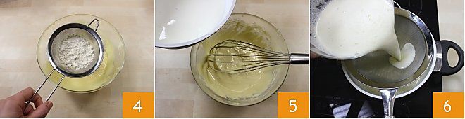 fügen Sie dann nach und nach das gesiebte Mehl hinzu 4 und schließlich die inzwischen lauwarme Milch 5. Vermischen Sie alle Zutaten sehr gut, dann geben Sie die Mischung in einen Topf, indem Sie sie durch ein Sieb filtern, um eventuelle Klumpen zu entfernen 6.