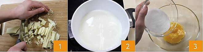 Um die weiße Schokoladenpuddingcreme zuzubereiten, hacken Sie die Schokolade mit einem Messer in kleine Stücke und legen Sie sie beiseite 1, dann geben Sie die Milch in einen Topf und erhitzen Sie sie bei niedriger Hitze, bis sie lauwarm wird 2. In der Zwischenzeit schlagen Sie die Eigelbe mit dem Zucker unter Verwendung eines Schneebesens, bis sie hell und schaumig sind 3,