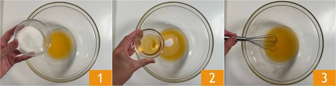Um die weiße Sangria zuzubereiten, geben Sie zunächst den Orangensaft in eine große Schüssel. Fügen Sie den Zucker 1 und den Orangenlikör 2 hinzu und rühren Sie, bis sich der gesamte Zucker aufgelöst hat 3.