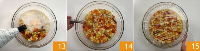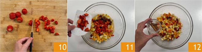 Schneiden Sie die Erdbeeren in Stücke 10 und geben Sie sie in die Schüssel 11. Fügen Sie die Zimtstangen hinzu 12 und mischen Sie alles gut durch.