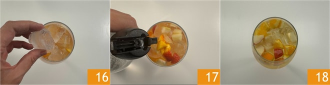 Sobald die Mazerationszeit abgelaufen ist, geben Sie eine Kelle Sangria in die Gläser, fügen Sie Eis hinzu 16 und passen Sie mit Selterswasser nach Belieben an 17. Ihre weiße Sangria ist bereit zum Servieren 18!