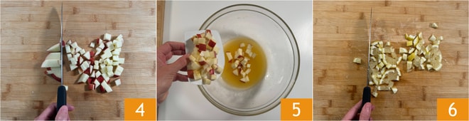 Schneiden Sie den Apfel in Würfel von etwa 1 cm 4 und geben Sie sie in die Schüssel 5. Schneiden Sie auch die Zitrone, ohne sie zu schälen 6.