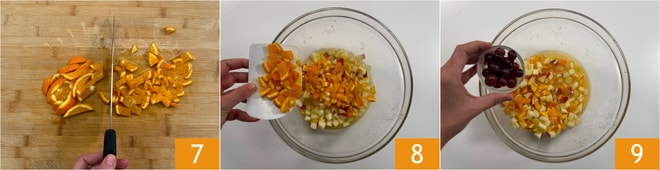Machen Sie dasselbe mit der Orange 7 und fügen Sie die Zitrusfrüchte in die Schüssel 8. Fügen Sie auch die Weintrauben hinzu 9, wenn die Trauben zu groß sind, können Sie sie halbieren.