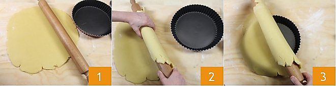 Zuerst den Mürbeteig ausrollen (klicken Sie hier für das Rezept), falls Sie eine süße Zubereitung machen möchten, oder den Blätterteig (klicken Sie hier für das Rezept) für herzhafte Gerichte. Den Teig auf eine leicht bemehlte Arbeitsfläche legen und mit einem Nudelholz auf eine sehr dünne Dicke von etwa 3-4 mm ausrollen 1, dann um das bemehlte Nudelholz wickeln 2 und in eine antihaftbeschichtete Tortenspringform legen 3. Wir haben eine 24 cm Springform für diese Menge an Mürbeteig verwendet.
