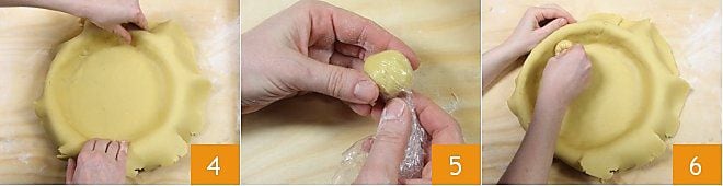 Drücken Sie den Teig gut in die Form 4; um Ihnen bei diesem Vorgang zu helfen, können Sie ein Stück Teig nehmen, es zu einer Kugel formen und mit Frischhaltefolie umwickeln 5 und verwenden, um den Mürbeteig perfekt anzupassen. Es genügt, leichten Druck sowohl an den Rändern als auch am Boden auszuüben 6.