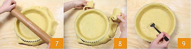 Drücken Sie dann mit dem Nudelholz auf die oberen Ränder der Form, um den überschüssigen Mürbeteig abzulösen und entfernen Sie ihn (7-8); Sie können den überschüssigen Mürbeteig auch mit einem kleinen Messer abschneiden. Lassen Sie den Mürbeteig dann 30 Minuten im Kühlschrank oder 15 Minuten im Gefrierschrank ruhen, damit der Teig fest wird und besser die Form behält.