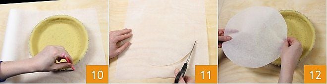Legen Sie die Form auf das Backpapier und zeichnen Sie mit einem Bleistift den Umfang der Form nach 10, dann ausschneiden 11 und den so entstandenen Kreis in die Form legen 12