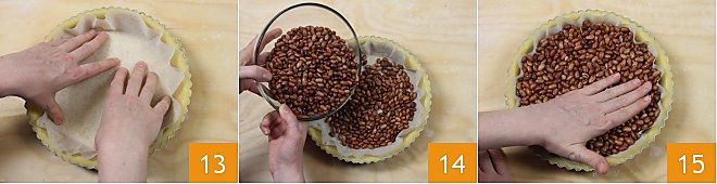 und so positionieren, dass auch die Ränder bedeckt sind 13. Legen Sie dann die getrockneten Hülsenfrüchte hinein 14, und pressen Sie sie gut in die Form 15: die Bohnen sollten bis zu den Rändern reichen, um die Wärme des Ofens gleichmäßig über die gesamte Oberfläche zu verteilen.