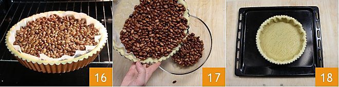 Backen Sie den Teig dann für etwa 15-20 Minuten in einem bereits auf 200 Grad vorgeheizten Ofen 16. Nehmen Sie ihn aus der Form und entfernen Sie die Hülsenfrüchte und das Backpapier 17, zu diesem Zeitpunkt sind die Ränder gut gebräunt, aber nicht der Boden 18. Backen Sie ihn erneut für 10-15 Minuten bei der gleichen Temperatur, damit der Teig trocknet und goldbraun wird.